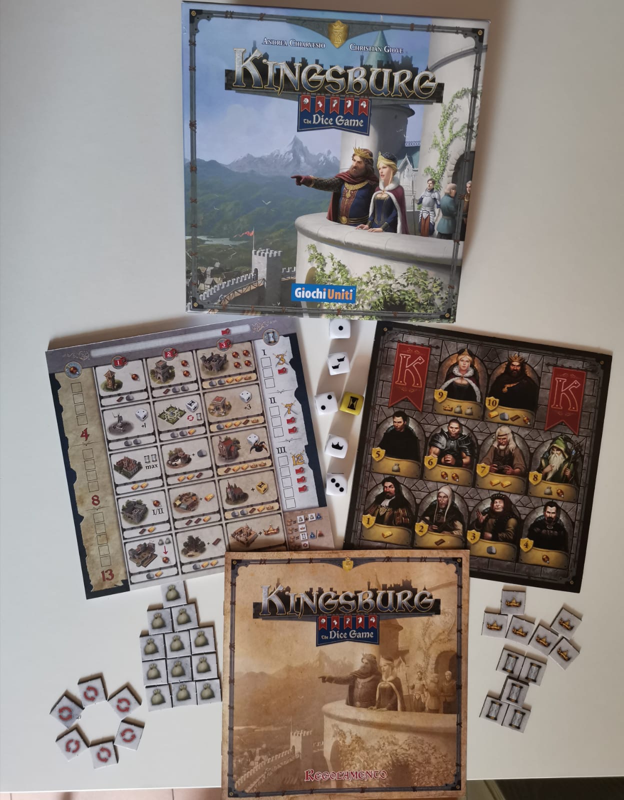 Questa è la piuttosto eloquente introduzione di “Kingsburg The Dice Game”, gioco di Andrea Chiarvesio e Christian Giove pubblicato dalla “Giochi Uniti” per 2-5 giocatori dai 10 anni in su, che è la versione “gioco di dadi” di beh….un gioco di dadi. I dadi saranno i nostri più fedeli alleati o spietati opponenti, visto che da loro dipenderà se e quanto riusciremo a raccogliere risorse, costruire edifici, influenzare i consiglieri e difenderci dagli attacchi dei nemici.